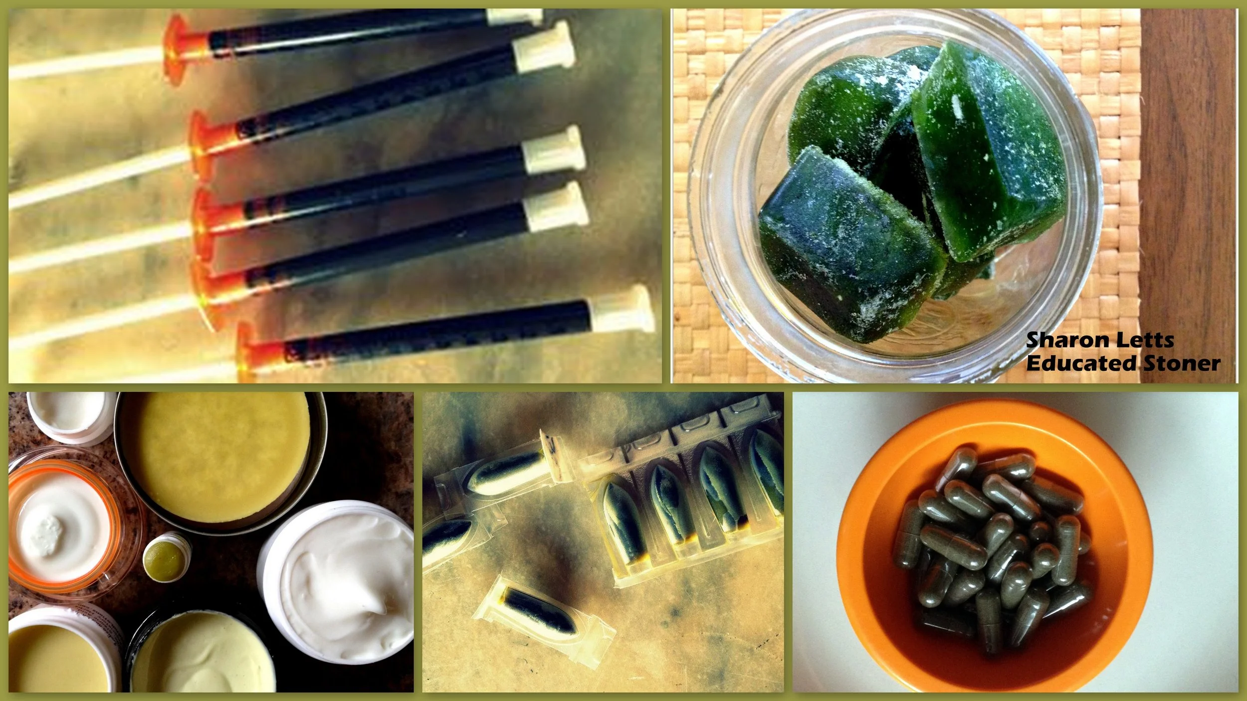 Since sharon began ingesting the strong oil, keeping cancer at bay and doing away with up to 10 prescription meds and supplements, she has found many ways to use the plant as medicine. Shown here (clockwise) Cannabis oil, juiced leaf (frozen in cubes), topical salves, suppositories (no head high), and kief caps. Not shown are tinctures, infused alcohol for tonic cocktails, infused herbal water, and eating fresh herbs, vegetables and fruits, daily. (see apothecary page for recipes.)